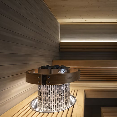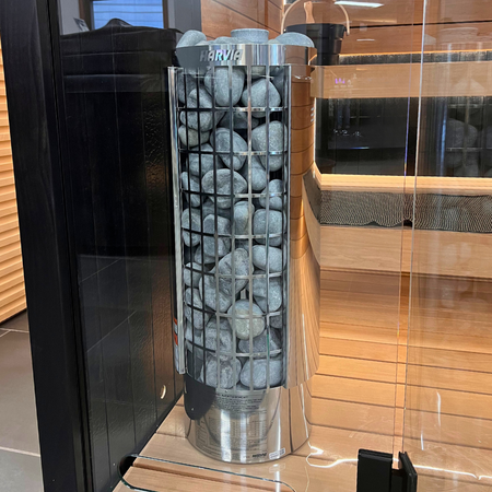The Harvia Cilindro is a sleek pillar-type electric sauna heater that produces high-quality steam due to its large stone capacity. Its pillar design allows for flexibility in sauna layout, as the heater can be easily integrated into the bench or positioned in front of a glass wall for an attractive display. The heater has a partially open outer casing at the front, which enables users to benefit from a large stone surface and accommodate a large number of stones in a small space. With its grate-like outer shell, you can control the steam intensity: pouring water on the side produces a gentler steam, while pouring or dripping water directly on the top of the stones generates a more powerful steam.